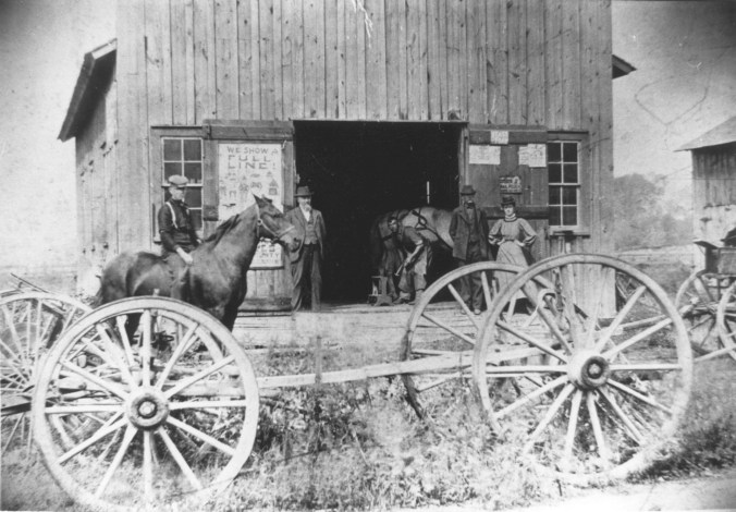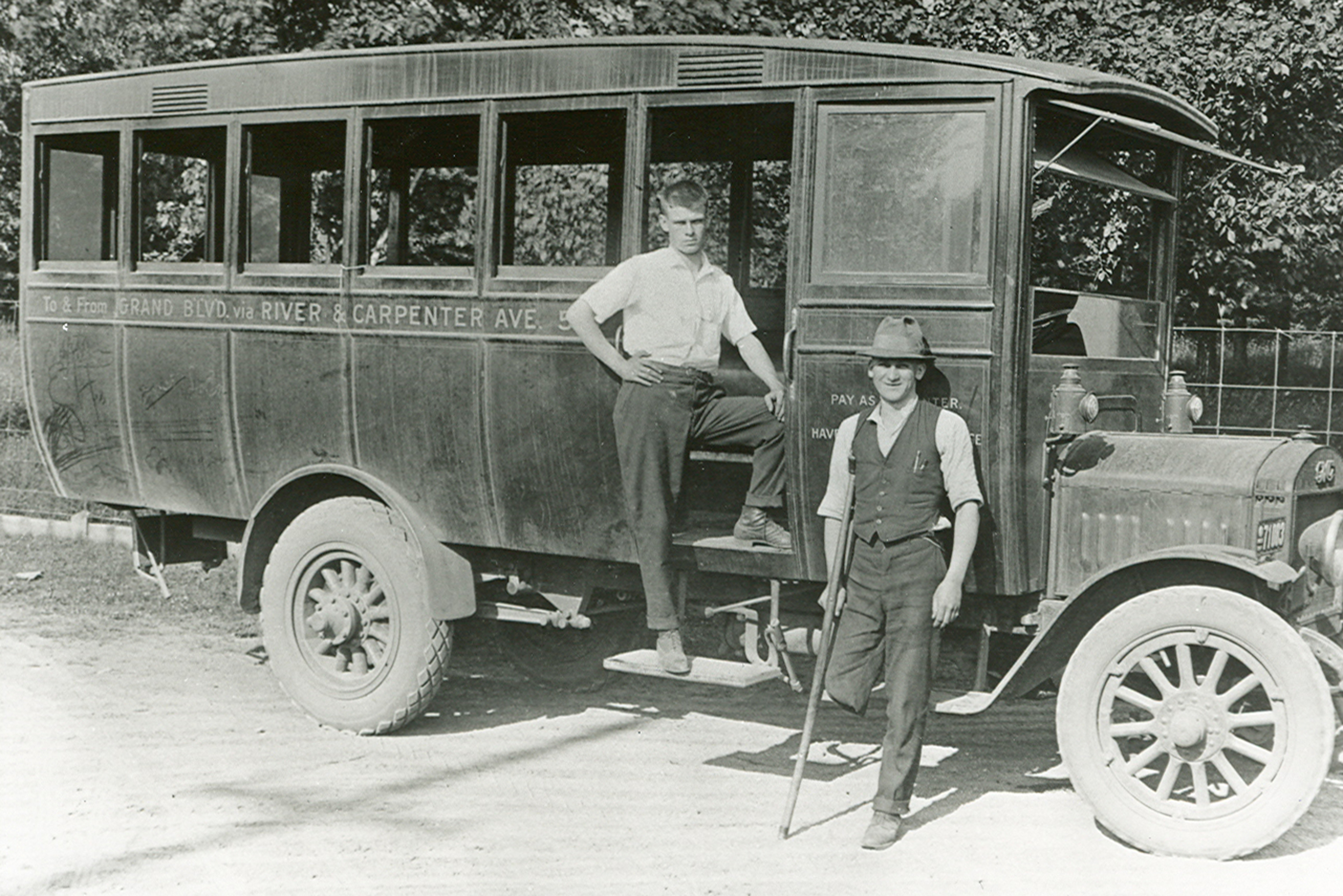 Photograph of Andrew Bjorkman’s jitney bus that traveled to and from Grand Blvd. via River & Carpenter avenue. The man standing at the bus door is unidentified, but the man with the crutch was Peter ‘Peggy’ Merzlac. The ride cost five cents, payable when entering the vehicle.