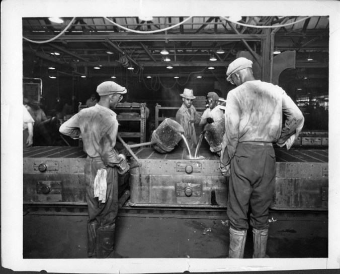 8×10 black and white Packard Co. file photograph of a 1928 Packard factory scene, four African American workers pouring molten metal into a steel mold, two men standing on either side of mold.