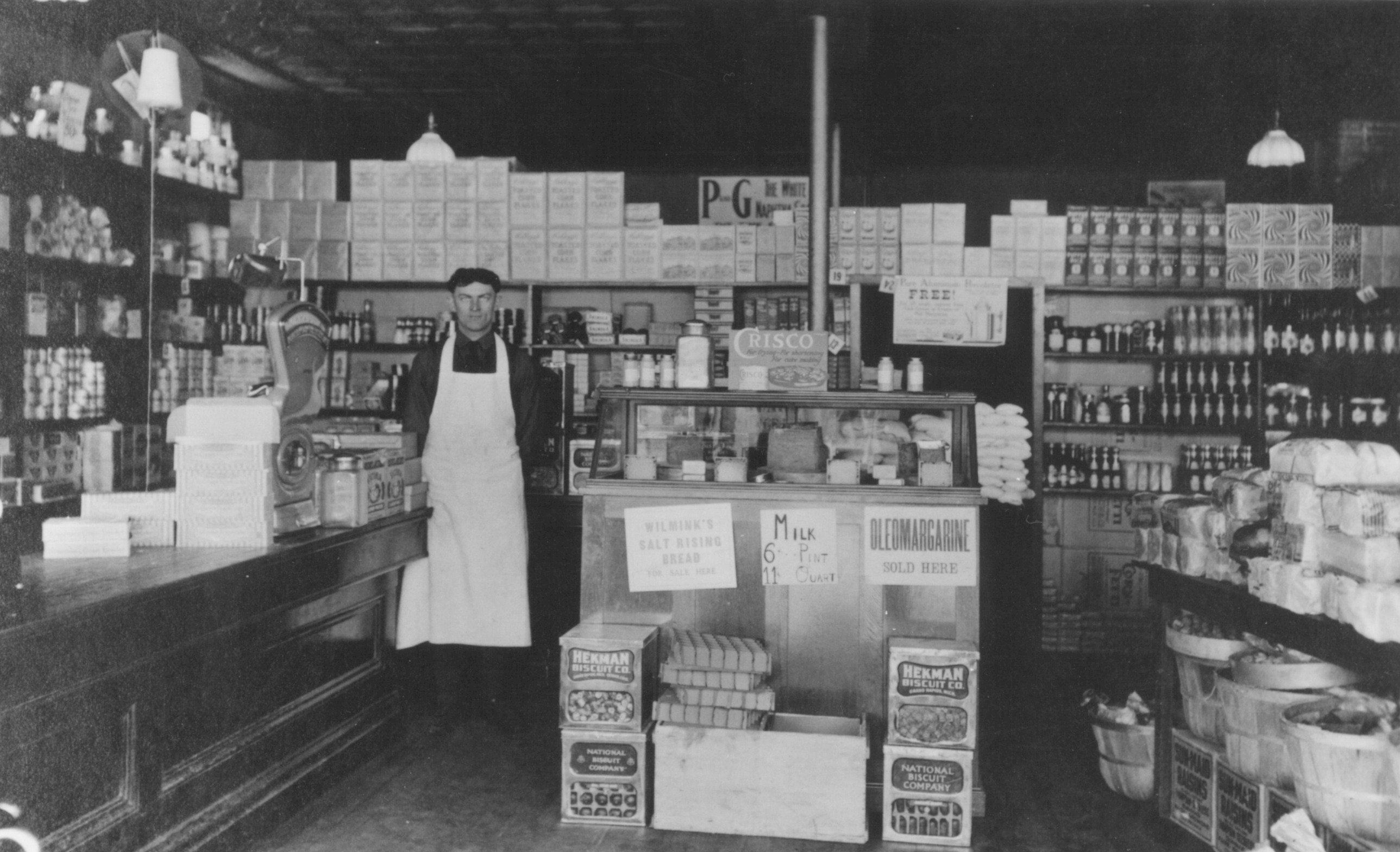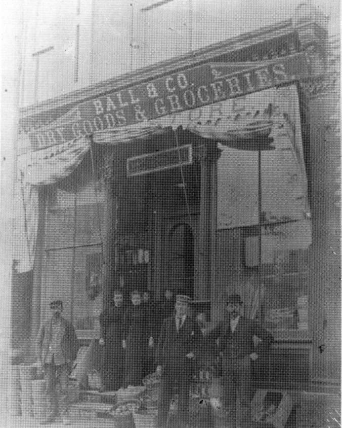 Black and white photograph four women and three men standing outside of Ball & Co. Dry Goods & Grocery Store, located on Washington Ave. Grand Haven, Michigan.