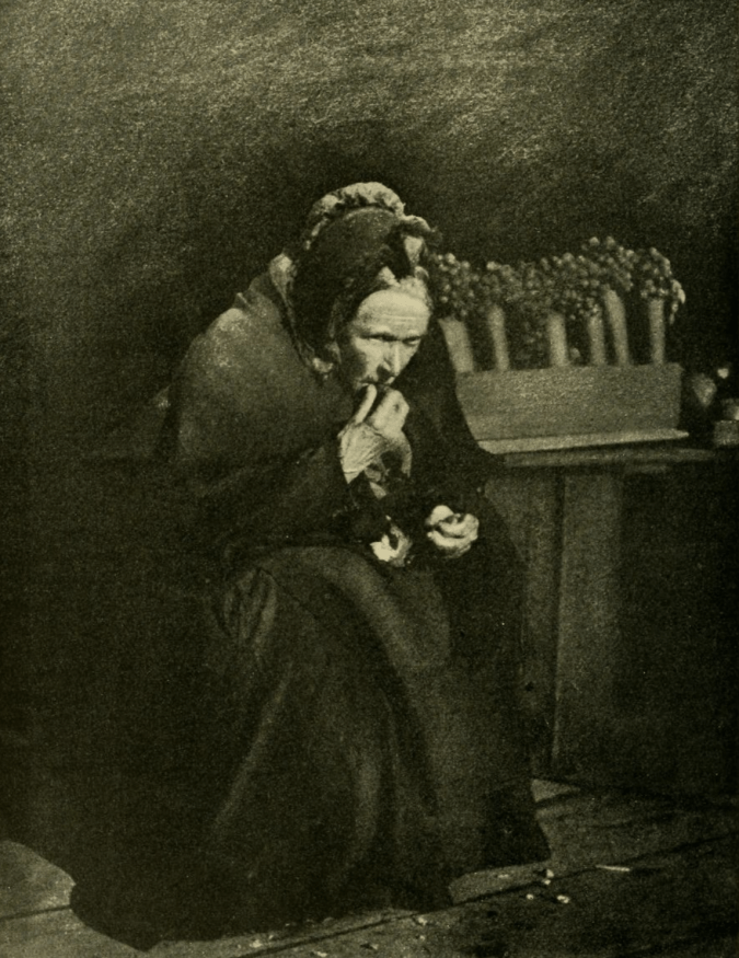 The dress, shawl and bonnet are styles from the Civil War. The photograph looks “staged” to me. So many were at that time. Did you notice all the seeds on the floor? The clothes look black as if in mourning.
