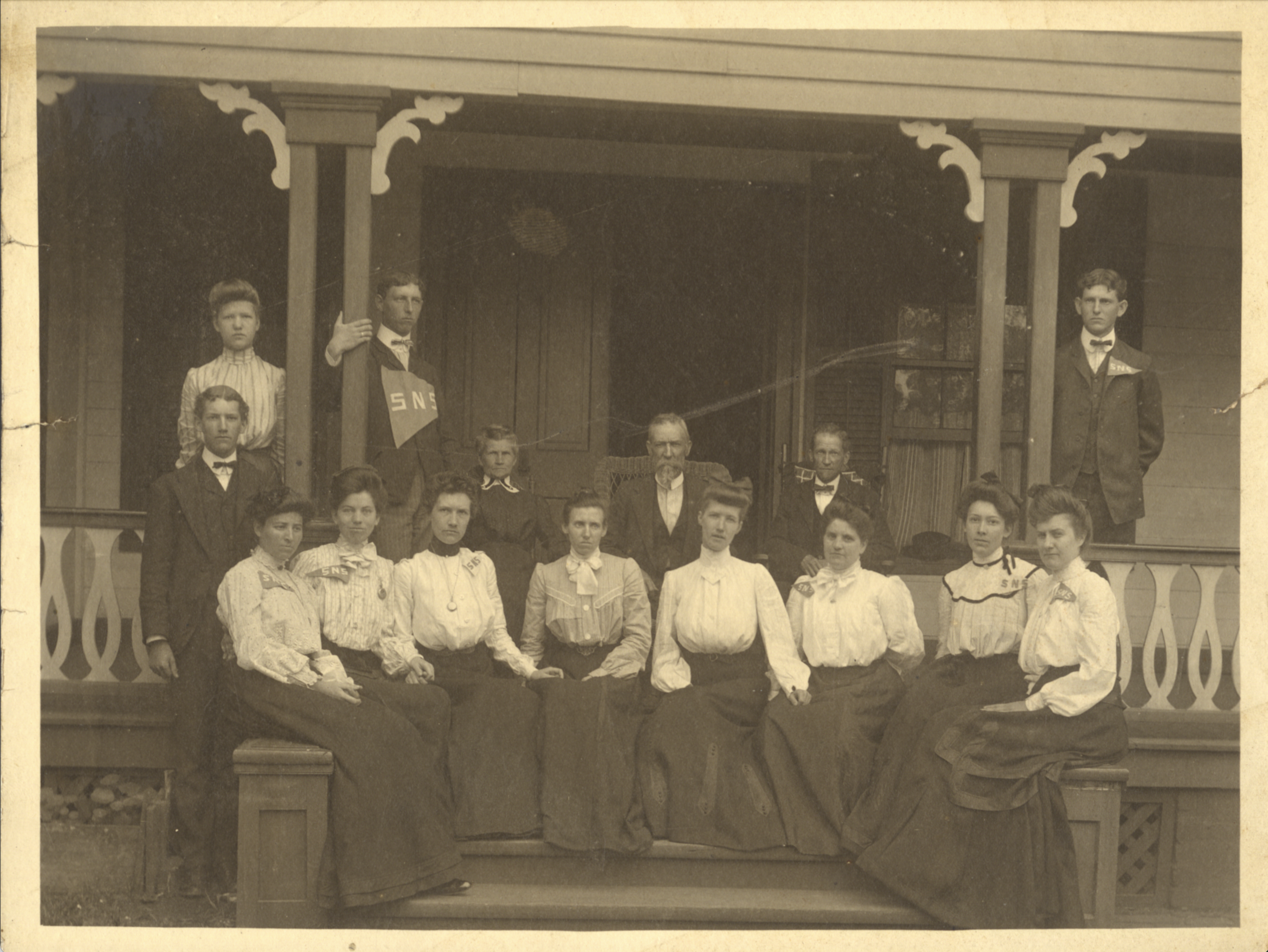 In 1905, universities and college did not provide dormitories. Students lived in privately owned boarding housing. This may be a photo of the residents of one of those private boarding houses, perhaps that of a local minister and his spouse who imposed strict rules considering the co-ed residency.