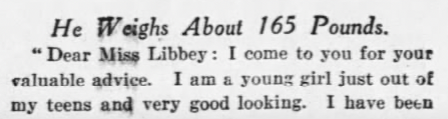 Our beloved Miss Libbey is back with the guidance we need. But beware! If you ask Miss Libbey for advice, you’ll get it… but there’s no guarantee you’ll like it. I bet more than one person regretted it once her column was printed.