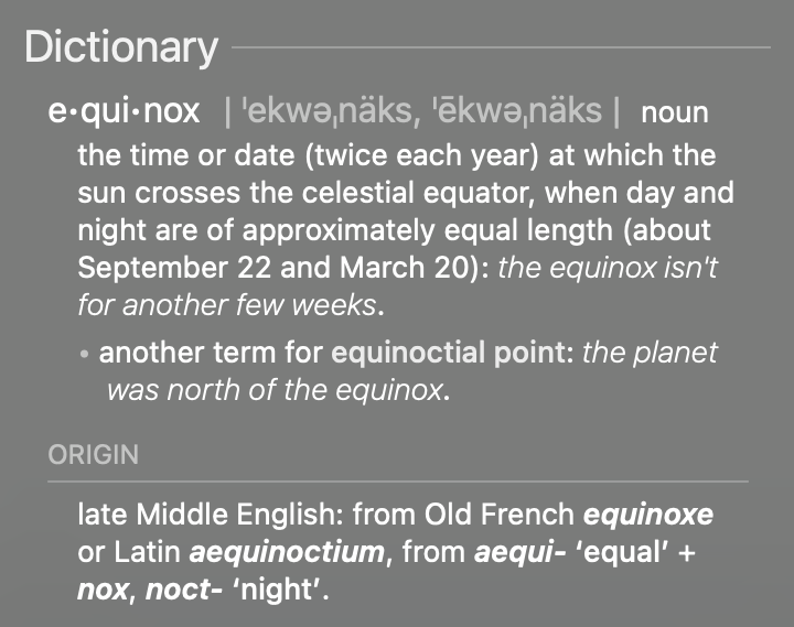 I didn’t know what a solar equinox was exactly until today. It refers to the moment when the Sun crosses the Earth’s equator. It appears directly above the equator, rather than north or south of the equator. On the day of the equinox, the Sun appears to rise “due east” and set “due west.”