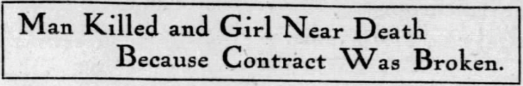 At first, Lucille thought that she would kill herself and thus leave her recreant lover free to carry out his plans. Then her proud, Spanish blood asserted itself and she made up her mind to make a target of William himself instead. She invited him, therefore, to a conference in the Empire hotel in Chicago on South Oakley boulevard. No one knows exactly what happened, but when entrance was effected into the room, William was found dying from a bullet wound in his head and Miss McLeod had a bullet hole in her breast.  This is the end of the crop of wild oats that every young man is supposed to sow, and which generally are reaped in the form of misery sorrow, trouble, affliction and devilment.