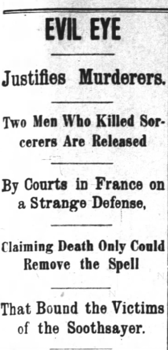 The newspapers grouped these tales together because both murderers cited the Evil Eye but the stories have a key difference. Merot’s neighbor brought it on himself with all of his doomsday projections. Cousin Francis seemed to be a perfectly upstanding citizen who was just incompatible with farm animals.
