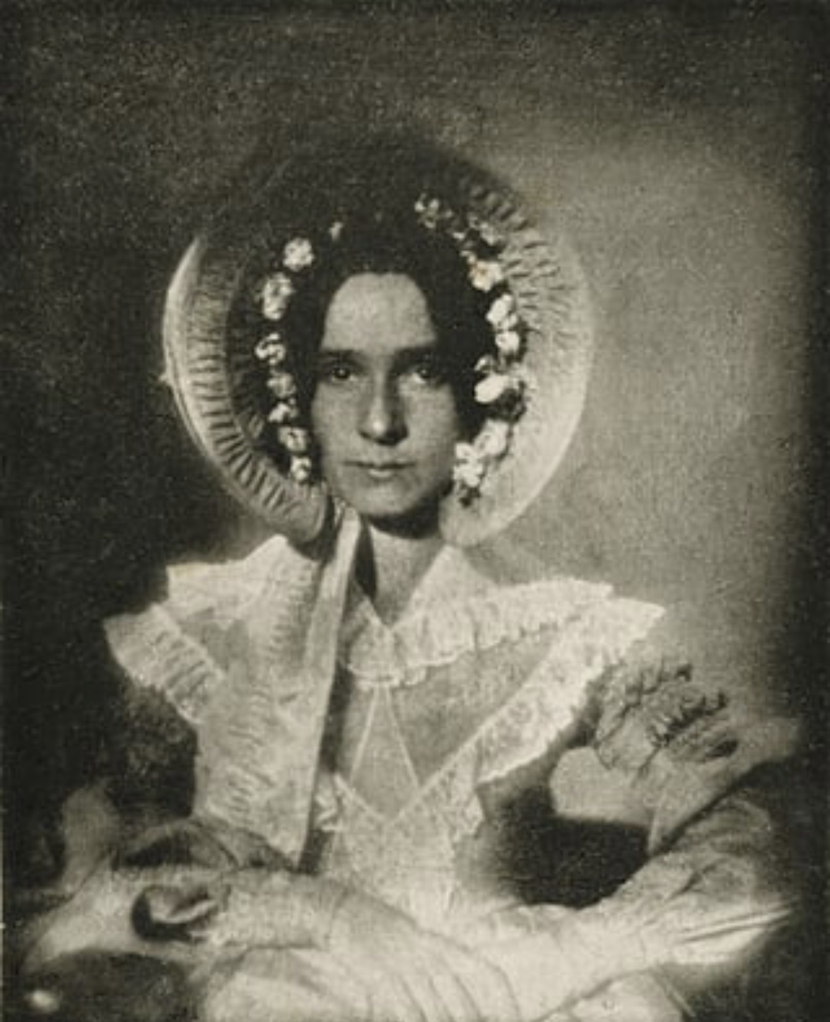 The picture was taken by her brother John Draper in 1840. Draper took the first known photographs of living people. His sister Dorothy was required to dust her face with white flour to enhance the contrast and pose unblinking for a 65-second exposure. (This is much harder than we might think. On average, people blink 15-20 times per minute!)