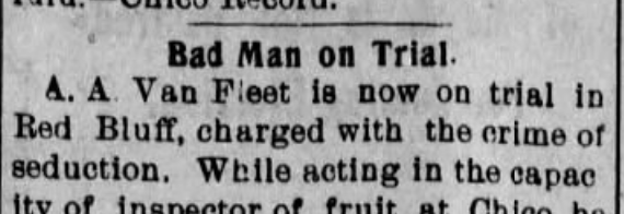 “Rev. and Mrs. George Davis testified to having said, in the presence of Josie Allen, that Van Fleet was a married man.” So reported the Red Bluff News on the trial of A.A. Fleet, who was charged with the seduction of Josie Allen, under the promise of marriage.