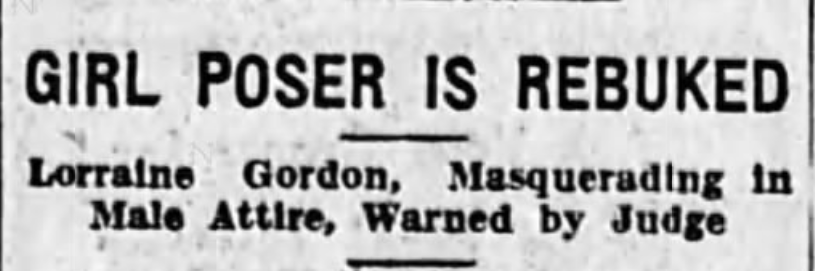 In January of 1929, Lorraine was in Portland charged with a different crime. “Mannish attire for girls on nights when goblins galivant in glee may be all right, but when a pretty 19-year-old girl persists in masquerading as a boy its time to call a halt,” the Morning Register advised. The official charge against Lorraine was masquerading. She was guilty, the judge acknowledged, but he let her go with a warning that “trousers are for boys and not petite, brown-haired girls.”