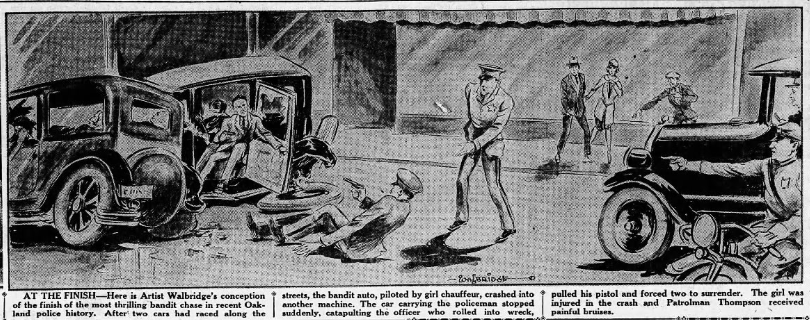 “Herbert entered the bank alone for the holdup yesterday afternoon. His girl partner remained at the wheel of the running car. Shoving a note that read “Give me all your money” to Davidson, Herbert brandished a gun. Davidson gave him $500 and the bandit fled. R. B. Schuler, 483 Forty-third street, saw Herbert brandish the gun and gave chase in his automobile. He picked up Policeman James Thompson, who clung to the running board of the car as it careened in pursuit of the fleeing bandit machine. Motorcycle Officer Leo Brandt also gave chase when the speeding bandit car flashed by him.