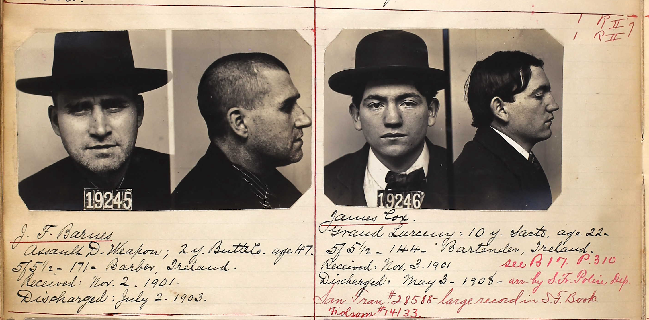 On the right, we have James Cox, a bartender originally from Ireland. Cox robbed a soldier recently returned home. He was initially charged with robbery but fortunately for him, he was connected. Senator Welch of San Francisco brought considerable pressure to bear to have his sentence lightened, and the charge was finally reduced to Grand Larceny.  The senator intended to go further, but Judge Hart said a “good deal of leniency” had already been exercised in his case and he refused to go any further.
