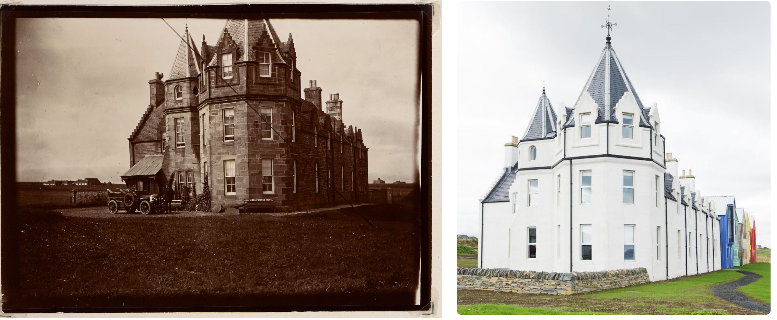 This one is called John O’Groats Hotel. It’s still open and operational, as you can see on the right. It’s very highly rated, if you ever find yourself in Scotland, looking for a place to stay.