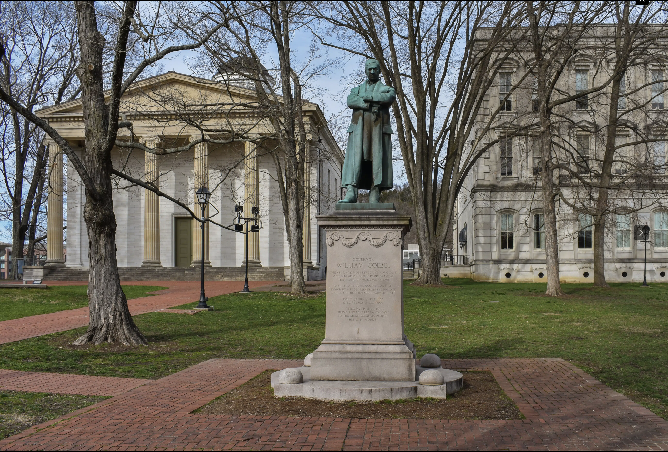 So who was William Goebel and what did he accomplish to justify a bronze statue on the grounds of the Kentucky State House in Frankfort, KY?