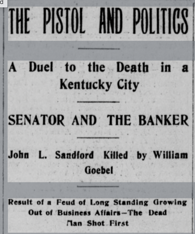 The feud between Goebel and Sanford ended on April 11, 1895, “in what some called a duel.” On that day, Goebel, accompanying Kentucky Attorney General W. J. Hendricks, walked to the First National Bank. The two men encountered Sanford on the street who stopped them to ask Goebel if he was the author of the article in the paper. As soon as Goebel responded affirmatively, Sanford drew a gun from his coat and within fractions of a second so did Goebel. Some say Sanford fired first. Hendricks claimed, “I don’t know who shot first, the shots were so close together.” Another witness was First National Bank President, Frank P. Helm, who endorsed Hendrick’s testimony when he said, “the shots were almost instantaneous and I cannot say positively which fired first.”