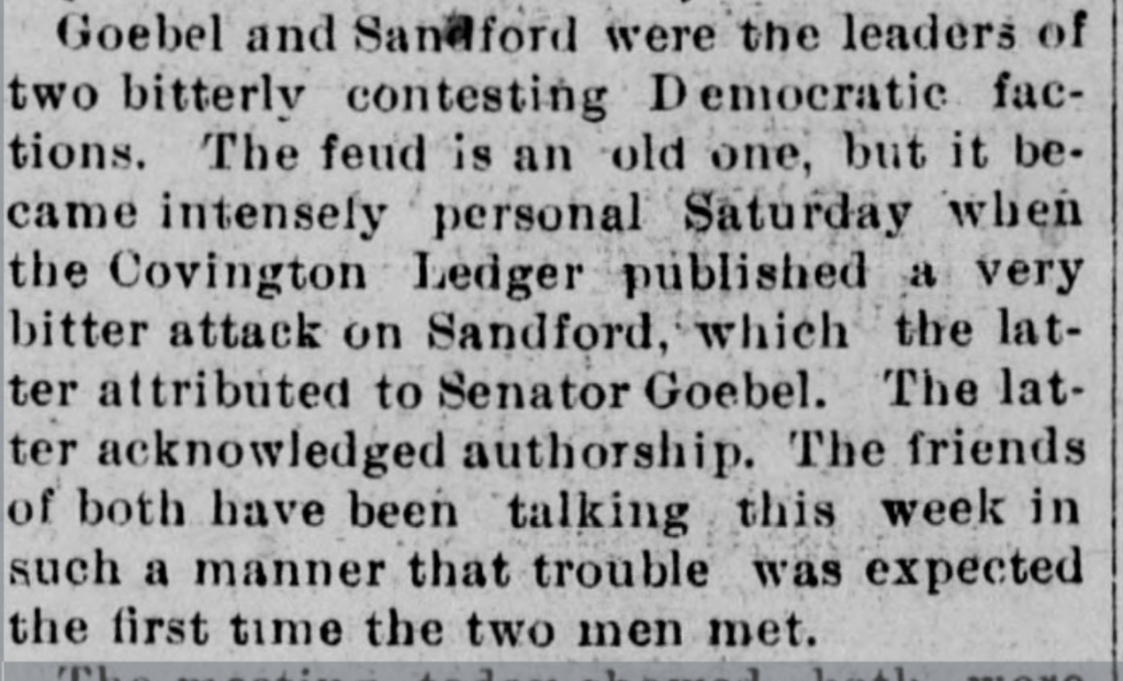 All of the constant, contentious issues caused a serious feud between Goebel and Sanford. The feud was amplified after Goebel instituted the removal of tolls on the roads that resulted in Sanford’s bank suffering financial losses. Then, Sanford was pushed beyond his limit of tolerance when Goebel published an editorial in the paper casting accusations of corruption against Sanford, calling the businessman/banker “Gonorrhea Sanford.”