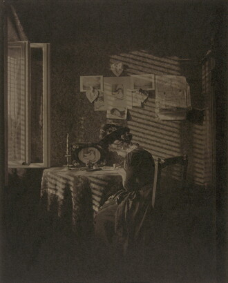The 1889 photograph was taken in Munich and features Paula Bauschmied, Stieglitz’ lover, seated at a table with her back to him. The photograph is such an interesting window into her psychology.  Most people had never had their photograph made and here is Paula, who appears decidedly unimpressed with this invention. She disregards the photographs of herself on the wall above her. Even as she is being photographed, her back is to the camera and she remains intent on her letter, preferring to write than to pose.