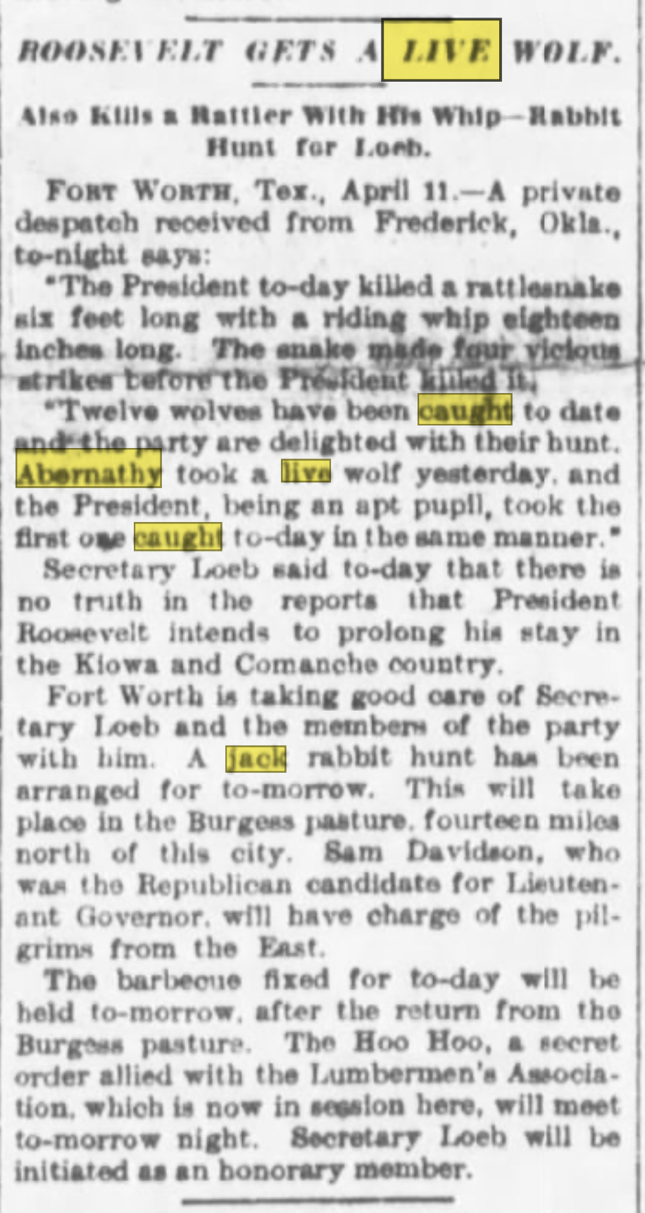The Country was infatuated with “Catch-em alive Jack” Abernathy and President Roosevelt, as shown by these examples of newspaper stories: