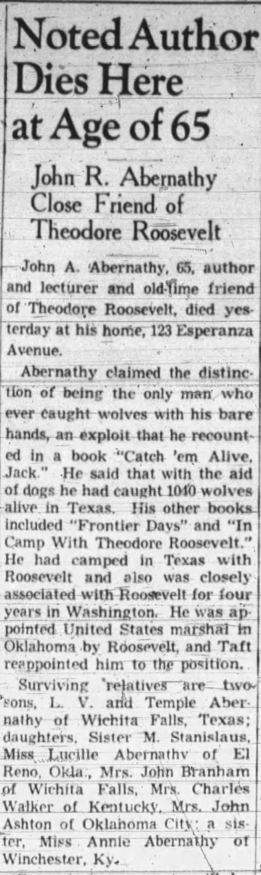 John “Catch’em alive Jack” Abernathy died in 1941 in Long Beach, California, and he was laid to rest in Wichita Falls, Texas.