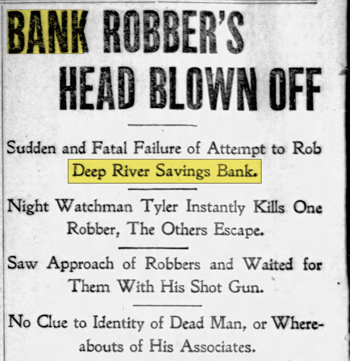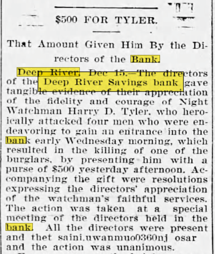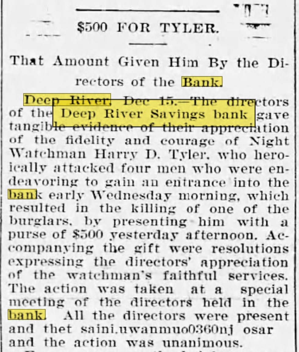 Harry D. Tyler was awarded $500 by the Deep River Savings Bank Trustees and after an inquest was found to have acted in self-defense; thus, he was not criminally charged for the death of the unknown robber. Tyler, according to some news reports, did suffer from PTSD following the shooting, referred to in the papers at the time as “brooding” over the life he had taken. He took one year off guarding the bank and spent that time building a boat that he later sold. Despite his own traumatic experience, Tyler was view as a hero by the Trustees, the customers of the bank, and the entire those living in the immediate area.