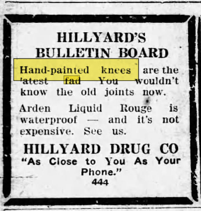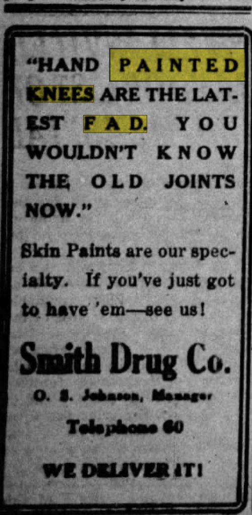 Painted knees were so popular it motivated the sellers of women’s cosmetics to advertise specifically to attract women who wanted to paint their knees. Some apothecaries and drug stores completely sold-out the cosmetics used to paint knees. Some beauticians hired artists to work in their salon to paint the scene a woman wanted on her knees.