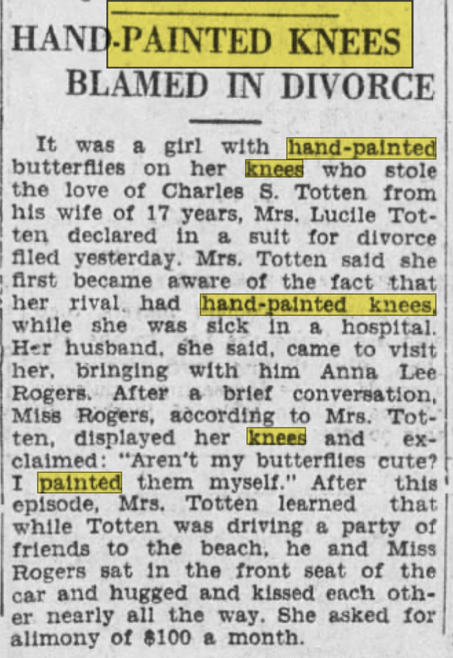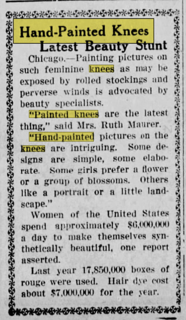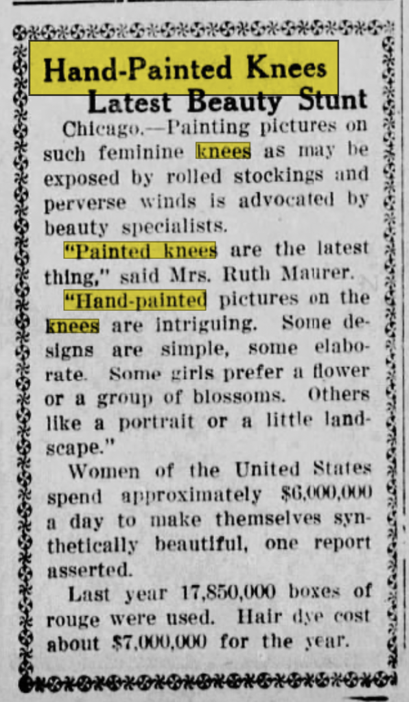 Headlined as Surprising Results of the Painted Knee, a full-page story in the Chicago Tribune’s American Weekly Magazine (reproduced nationally), reported the latest fad in woman’s styling and cosmetology – including some anecdotes that were suspected not to be credible.