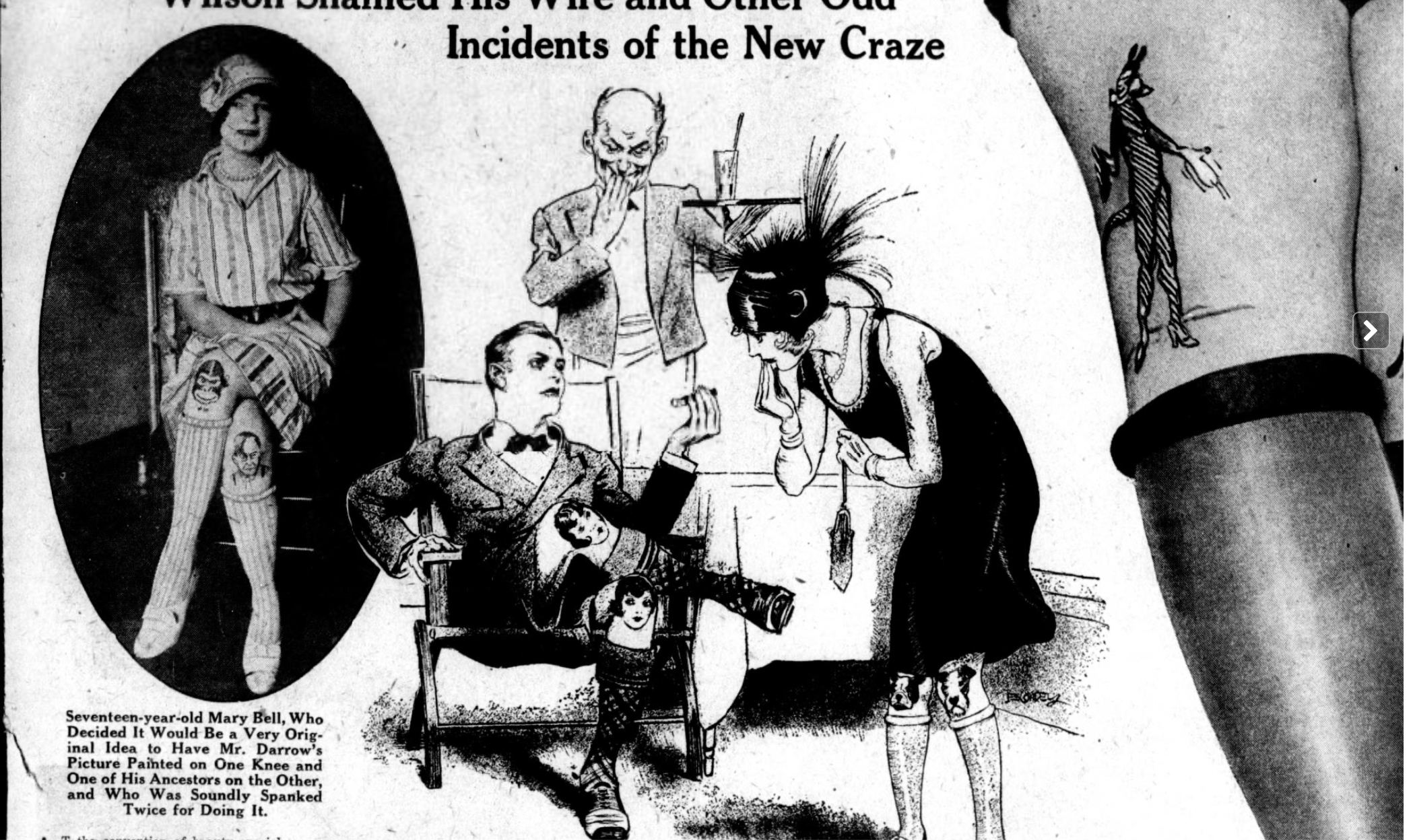 “Without glancing at the horrified crowd of ladies . . . he picked up a magazine and started to read. In horror Mrs. Wilson looked at his knees. His knickerbocker were rolled up and his stockings were rolled down. Painted on the bony and powerful but not very pretty knees . . . . were the startling likenesses of two of the popular young women of the town.” By nightfall, Arthur Wilson was the talk of the town and painted knees are no longer the fad among the ladies of the city.