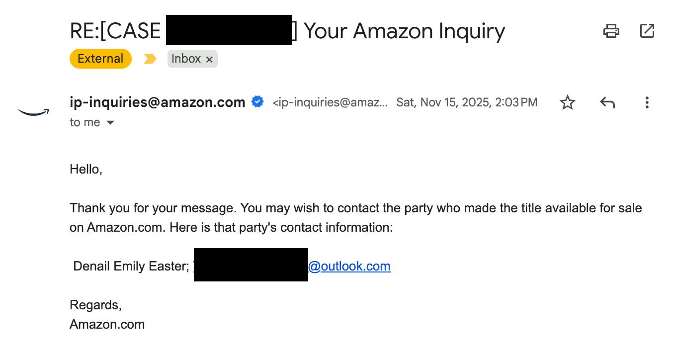 Amazon didn’t knowingly facilitate Denail Emily Easter’s plagiarism. They probably get requests like mine every day. Their responses are intended to mitigate risk to Amazon, even if that shields people who use their platform to publish, sell, and distribute stolen work.