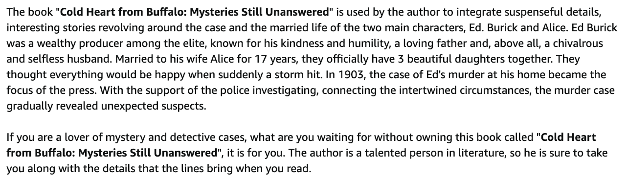 I felt violated when I opened it. Denail Emily Easter had plagiarized my entire book, removing only the pictures. Cold Heartis more than something that belongs to me. It’s a very personal book. And I’d spent hundreds of hours researching this obscure crime, uncovering the details, and writing the book. This person stole it, pasted his name on the cover, and spent the past two years selling it on Amazon!