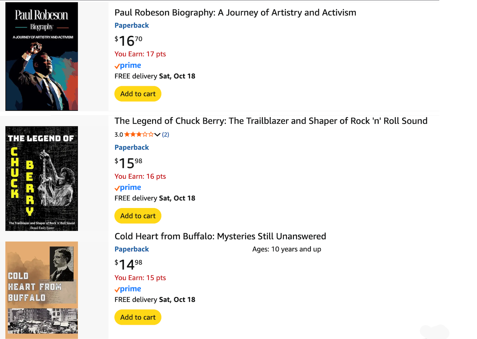 Denail Emily Easter was also listed as the author of books about Chuck Berry and Paul Robeson. All three books had similarly illiterate descriptions, but the preview feature revealed the books were well written. Curiously, all three books were published on the same date: June 7, 2023.