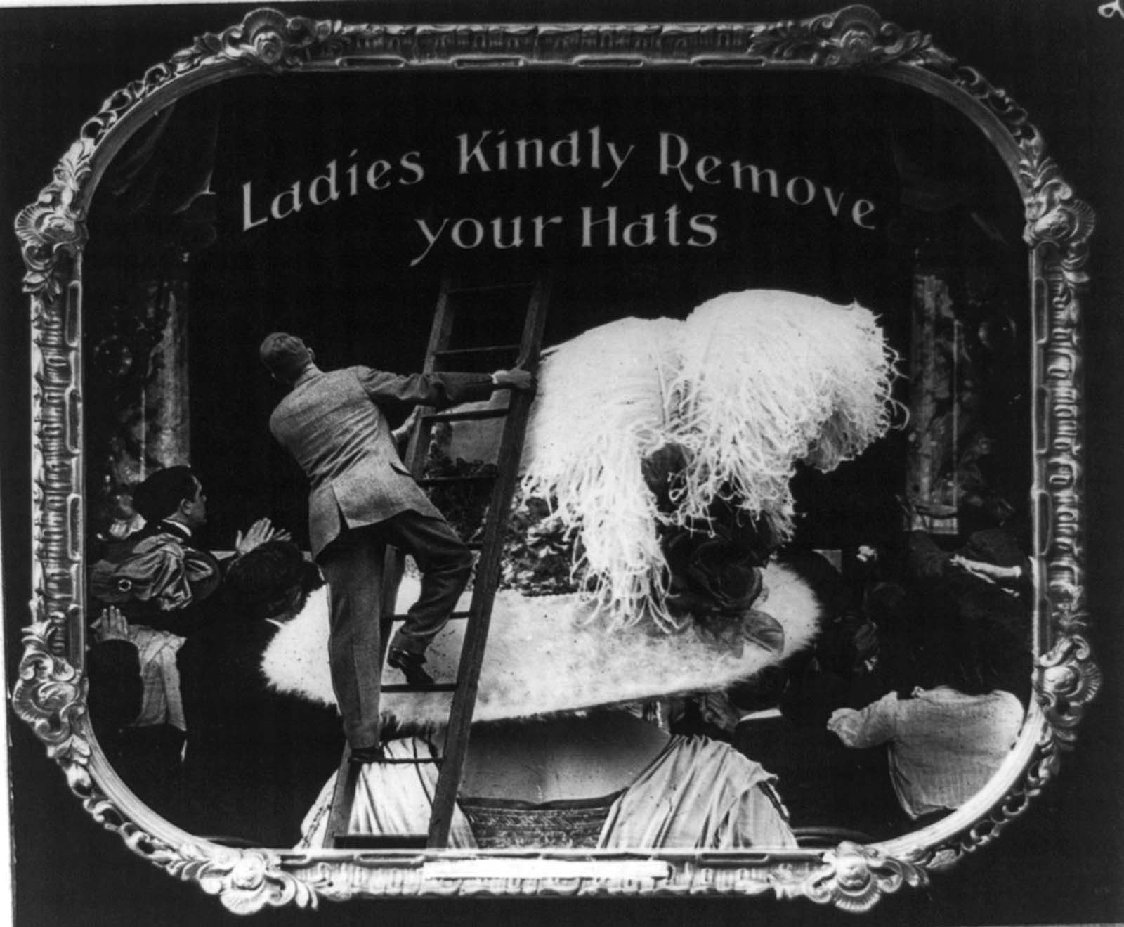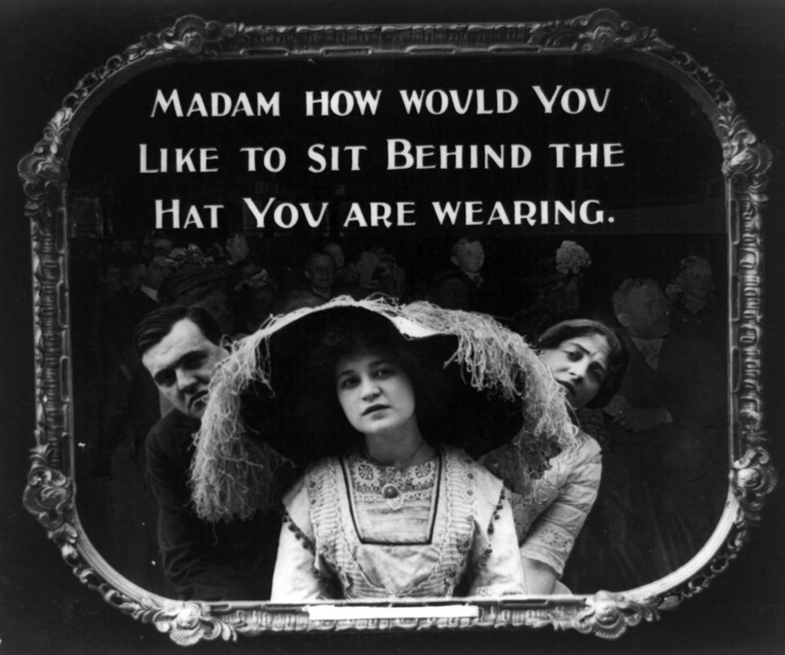 In the 1910s, ladies’ hats were in their heyday.  I must say, this wasn’t the most welcome trend for moviegoers.