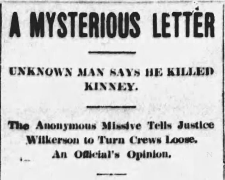 At the inquest, the jury cast doubt on the charge against Crews. He had a strong alibi and swore he had no hard feelings against the tailor. On December 23, Justice Wilkerson decided there was no reason to detain Crews and released him. The following day, an anonymous letter arrived at the judge’s chambers.