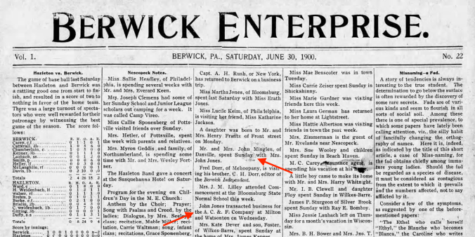 The first crack in the case appeared in July of 1900. A prominent woman in Berwick society named Harriet Jones was walking home from church and fell in step with a neighbor. As they walked, Mrs. Jones told her friend the details of a recent scandal. The woman didn’t betray any surprise but she was struck by Mrs. Jones’ statements because they were identical to the accusations made in an anonymous letter that a prominent businessman had received a few days earlier. The neighbor bid Mrs. Jones goodbye but she was suspicious enough to repeat the conversation to her husband.