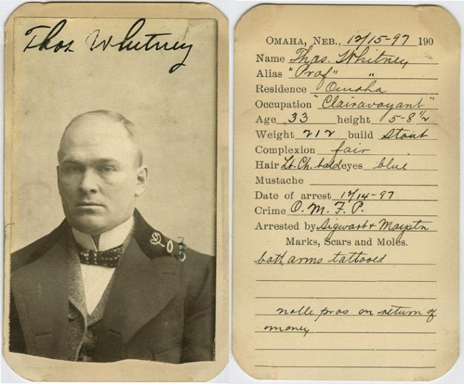 In December 1915, an unlikely prisoner was marched into Omaha Police Court. He was Thomas Whitney, better known as “Prof”, an astrologer, clairvoyant, and fortune-teller. The Prof seemed to have been doing well with his readings, but somewhere along the line, he met an unhappy customer…so unhappy he had the Professor charged of eliciting money from him under false pretenses.