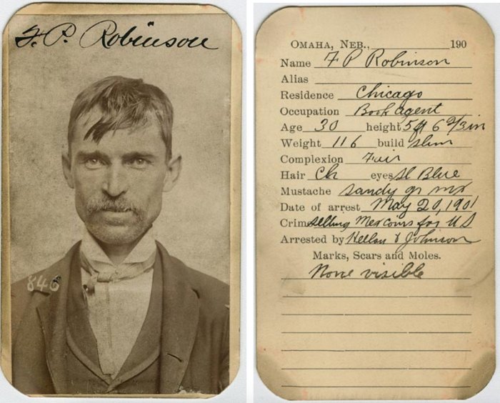 Robinson appeared in an Omaha saloon one afternoon and ordered a beer for 5¢. Robinson paid his tab with a Mexican dollar, which at the time, looked very similar to an American dollar. But the exchange rate of a Mexican dollar was only about 45¢. He should have received back 40¢ in change, but the saloonkeeper did not look closely and–assuming it was an American dollar–gave him back 95¢. Let’s hope Robinson enjoyed his beer and temporary illicit possession of 55¢ because his career as a criminal mastermind was destined to be short-lived: Omaha authorities arrested him for fraud.