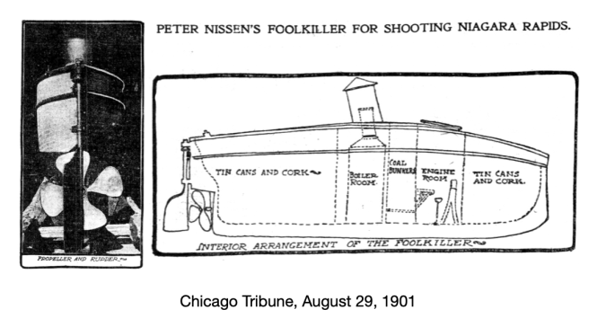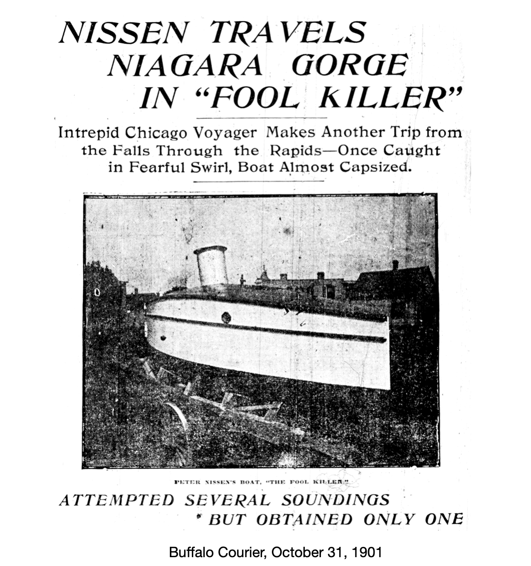 The Edison Manufacturing Company filmed the event. The company reported the event as “ . . . Captain P.N. Nissen, formerly known as Captain Bower, marking a trip through the Whirlpool Rapids in his famous twenty-four foot craft known as the “Fool Killer.” The 1:42 long movie is posted on YouTube.