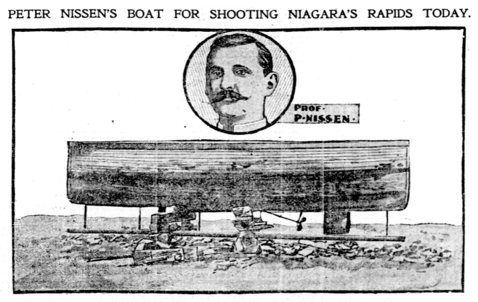One newspaper reported that Nissen worked as a bookkeeper for Jesse & Rosberg, but lived in poverty. (One can only assume that was because he spent his money on building his inventions for daredevil feats.) His death certificate issued in Michigan reports him as single and his occupation as a foreman in a furniture factory. Whatever his occupation, Nissen did not find it as satisfying as being a daredevil, twice taking on the daunting challenge of boating through the rapids and the “Whirlpool” of the Niagara Falls River. His trip was planned to go from the Falls to Lewiston, NY, via the Niagara River, in his ingenious craft specifically designed to withstand the whirlpool rapids, that he named Foolkiller.