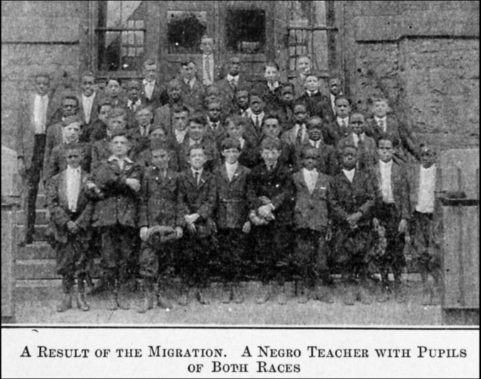A 1922 photo by Carter G. Woodson captioned “A result of the migration. A Negro teacher with pupils of both races.” Courtesy of The New York Public Library.