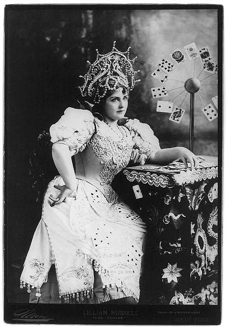 1895 Actress and singer Lillian Russell, with cards at table, in The Tzigane (fortune teller)