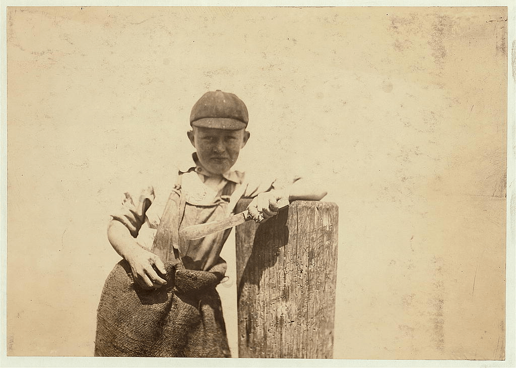 He photographed the boy holding a butcher knife and modeling a badly cut finger, and noted, “Several children working with him had cut fingers, and even the adults said they could not help cutting themselves. August 1911.”