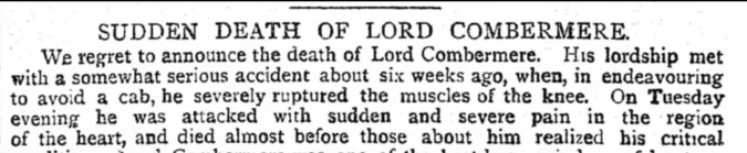 On December 1, 1891, tragedy struck when Wellington Henry Stapleton-Cotton, the second Viscount Combermere, perished at the age of 73. Six weeks earlier, while attempting to hail a cab in a busy London street, Lord Combermere, as he was known, had been forced to leap out of the path of a horse-drawn carriage to avoid being struck. It seemed lucky escape at first but, according to the Pall Mall Gazette, the muscles in Lord Combermere’s knee ruptured. He appeared to be on the road to the recovery and was learning to walk with crutches, so family members were taken completely by surprise by his sudden death. Unbeknownst to them, a blood clot formed following his accident.