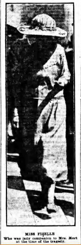 “About 14 minutes later I heard what sounded like a revolver shot,” Miss Fizzele said later. She ran to Mrs. Mort’s room and found the door ajar. “Mrs. Mort was not there. I went to the drawing room door, which I found locked.”