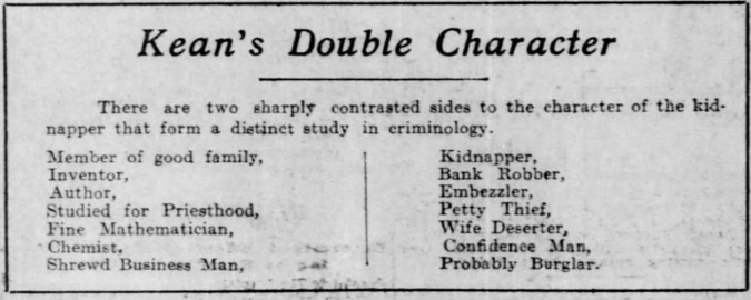 Mrs. Kean immediately announced her plans to take the three children she and Kean shared and leave the city. The newspapers explained that Kean came from a respectable family and, at times, was respectable himself. They used a table to illustrate Kean’s double character. On the left, his supposed good traits are listed. On the right, we see his sins–the gravest of which is “Probably Burglar.” (John Kean didn’t need any more trouble at the moment, but you could argue that being a chemist, author, or inventor isn’t necessarily a character virtue. Someone invented asbestos, right?)