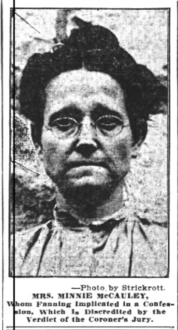 Fred Fanning and Mrs. McCauley were in jail, awaiting the chemist report and a coroner’s jury. Fanning had confessed, in grisly detail, how he murdered Mrs. Mary Short, at Mrs. McCauley’s instigation. During his confession, Fanning said he took a purse containing $61.60 belonging to the woman and told the police about $45 he had left with Mrs. McCauley. The remaining $16.60 was missing.