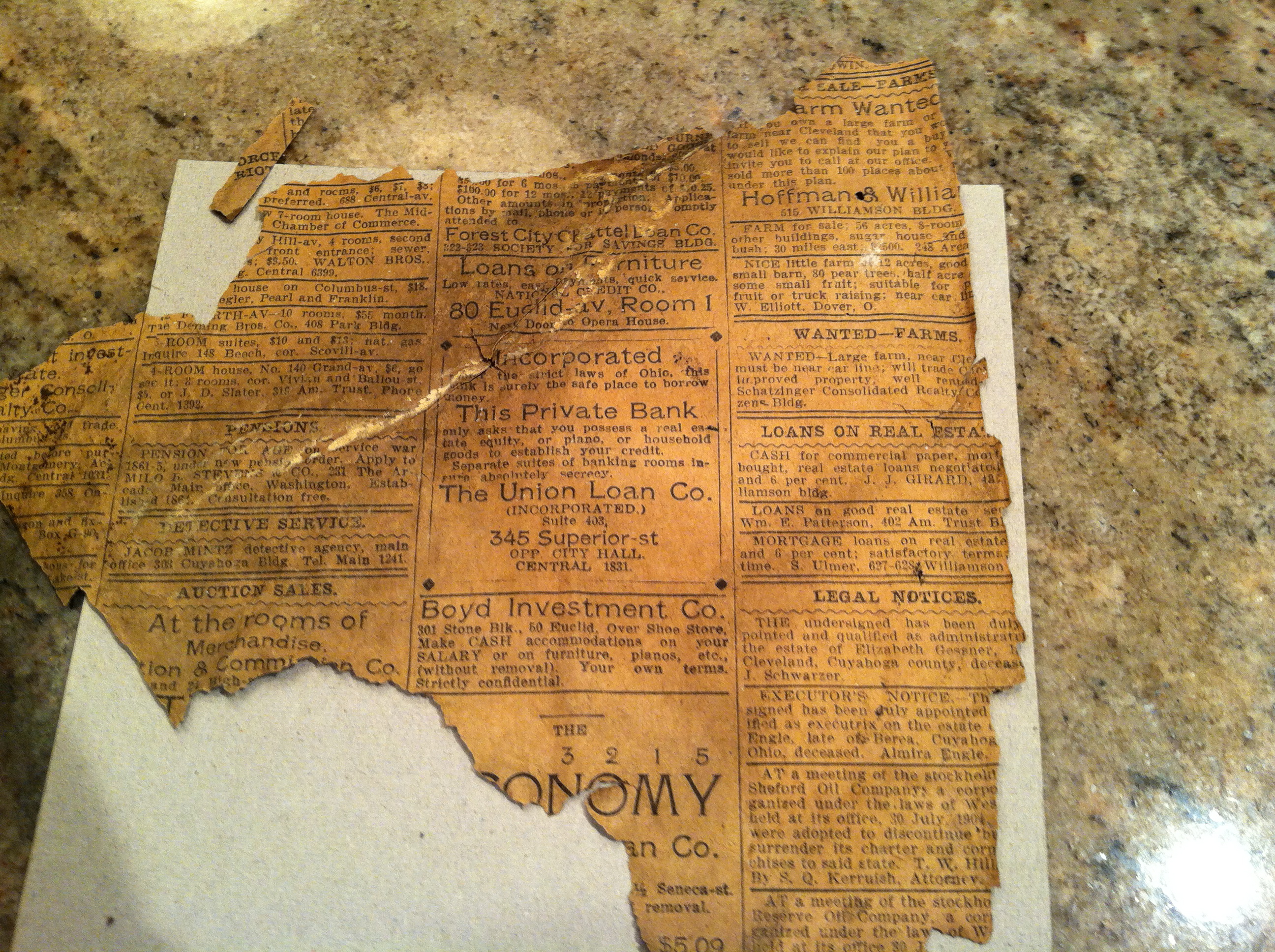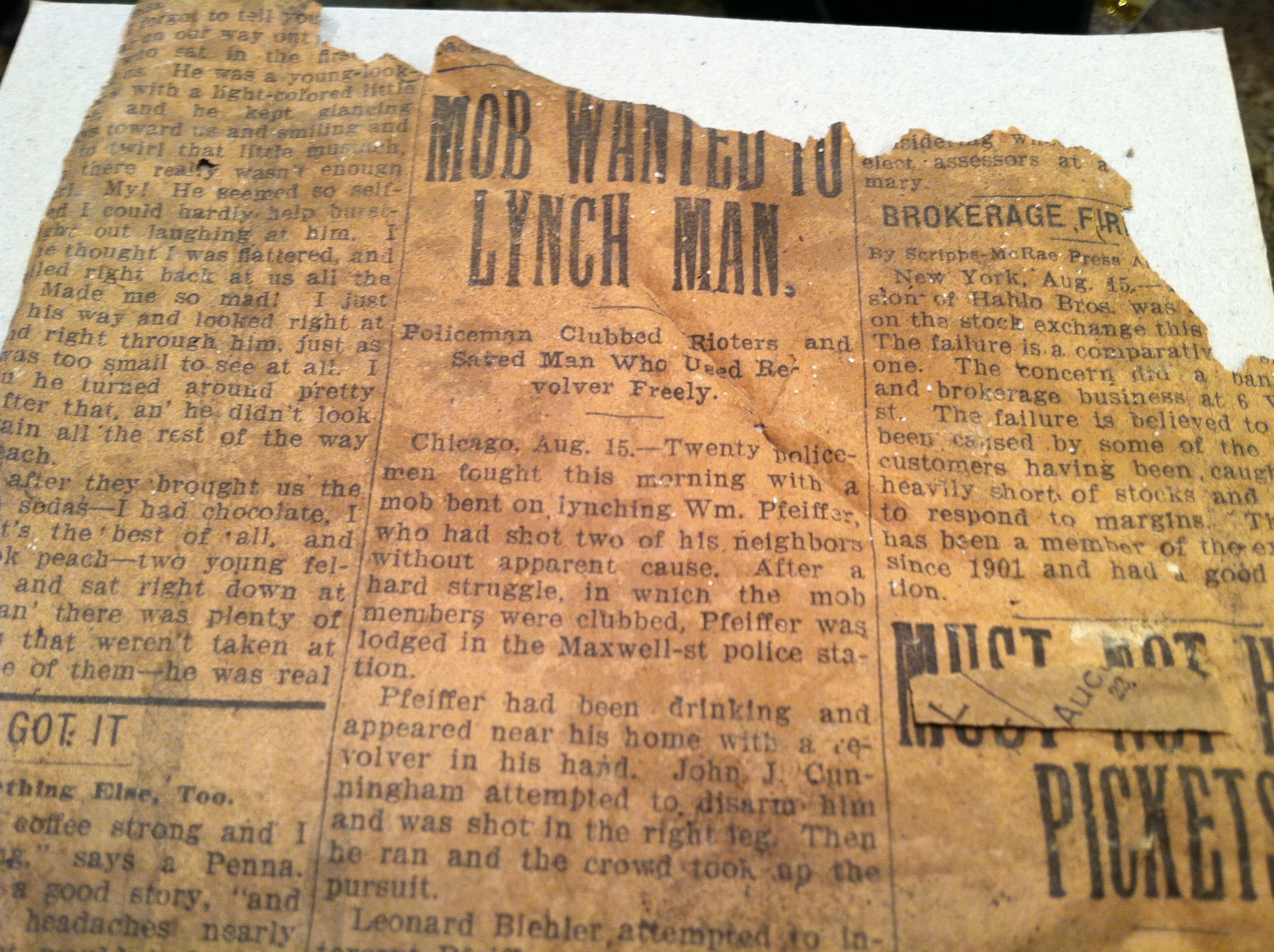 While renovating his home, he found some newspaper stuffed in the wall that had been used for insulation. The story features a mob that tried to lynch a man. There are some classified ads on the opposite side of the paper.