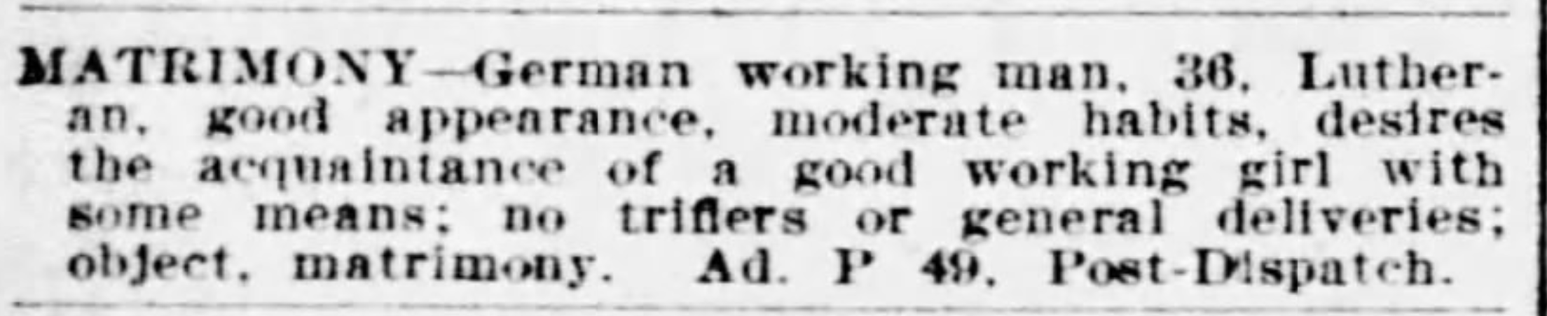 I picked out a few ads from an 1899 edition of the St. Louis Post. I’ll give you my impression but many of you are far better at reading between the lines than I am. I’m very curious to hear what you think!