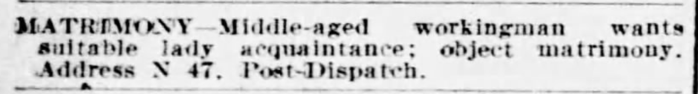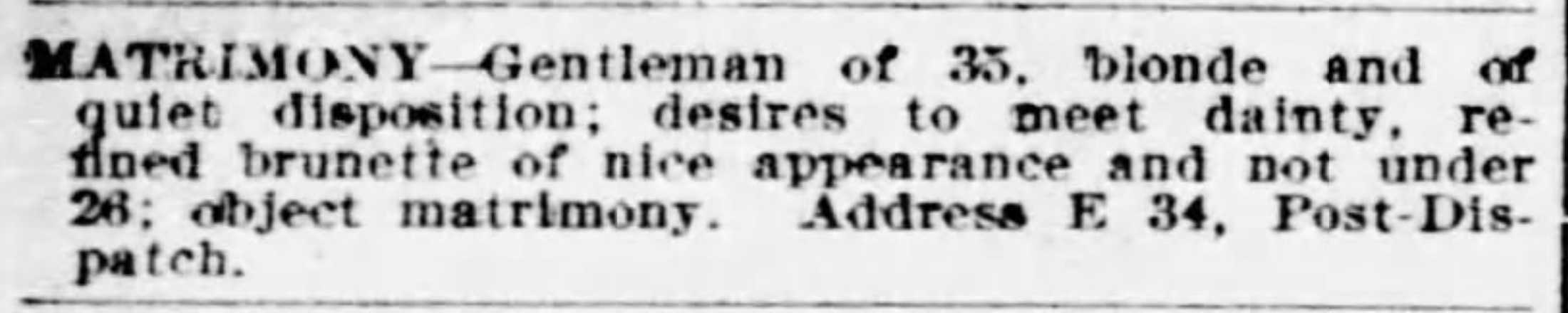 The last ad is another curiosity. Perhaps it’s even a little sinister. This gentleman tells us nothing about himself except that he’s 30. He’s specifically looking for an affable young widow. At 30, it seems odd he would be specifically seeking a widow, doesn’t it? That would make more sense if the gentleman was 55 or 60. On the other hand, he doesn’t mention money.