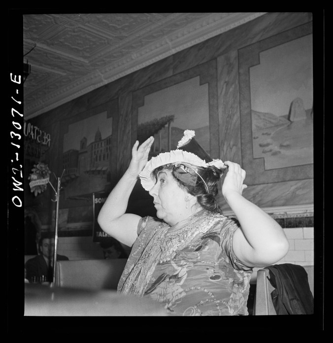 Gypsy woman putting on a paper cap on New Years’ Eve in an Italian restaurant on Mulberry Street, NYC