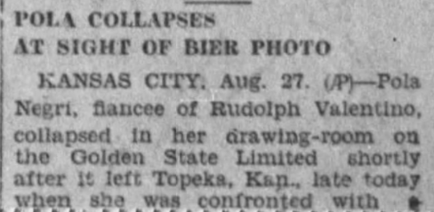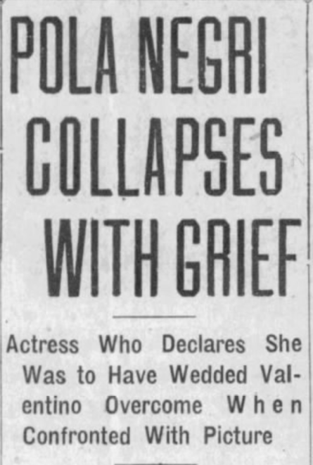Pola was hysterical with grief. Reportedly Negri threw herself across Valentino’s open coffin in despair She put on quite a show, falling into hysterical sobbing fits and fainting repeatedly for the cameras. His first funeral was held at St. Malachy’s in New York City. Valentino’s body then traveled by train to Hollywood, where he was laid to rest after another funeral.