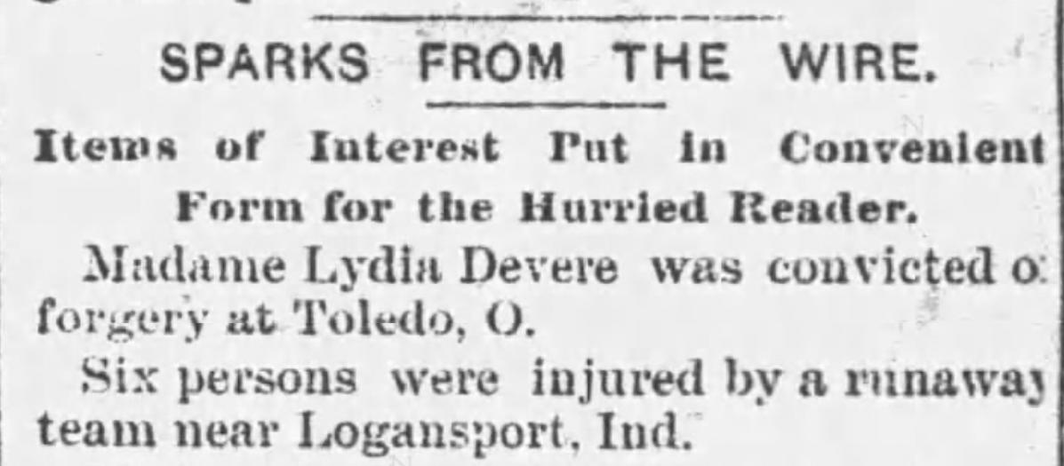 Cassie had started out the 1880s as a clairvoyant with a clear record, except for the minor record in Canada. By 1889, she had been married three times, divorced twice, widowed once, had a child, adopted a few aliases, was a well-known con artist, and she was under federal investigation for forgery. After the death of her third husband, C.F. Hoover, she returned to her earlier alias Madame Lydia Devere.