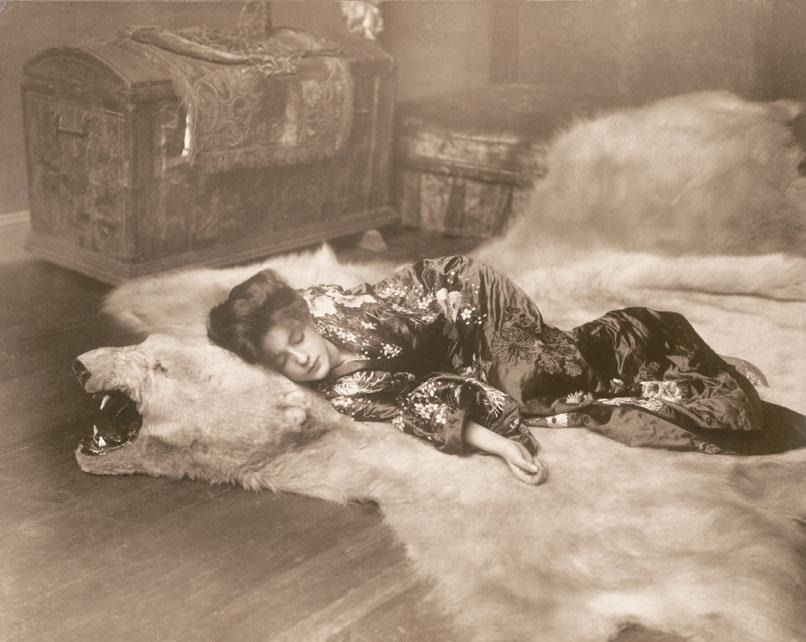 This photograph of Evelyn, seemingly asleep on a bear skin rug at White’s studio, was taken in 1902 by Rudolph Eickemeyer, Jr.