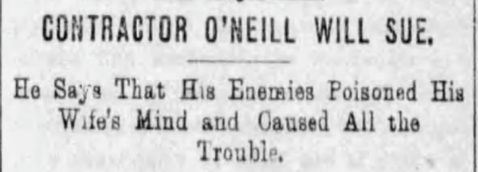 “I wonder sometimes how I am alive,” O’Neill fumed. “The neighbors of my dead wife have been here and as they went down stairs they hooted me. I always treated her well. When she left my Eagle street house and moved here, I gave her $70 to live on. Everybody will tell you I treated her well. I am boarding with Mrs. Roberts. Nothing wrong has taken place between us.”